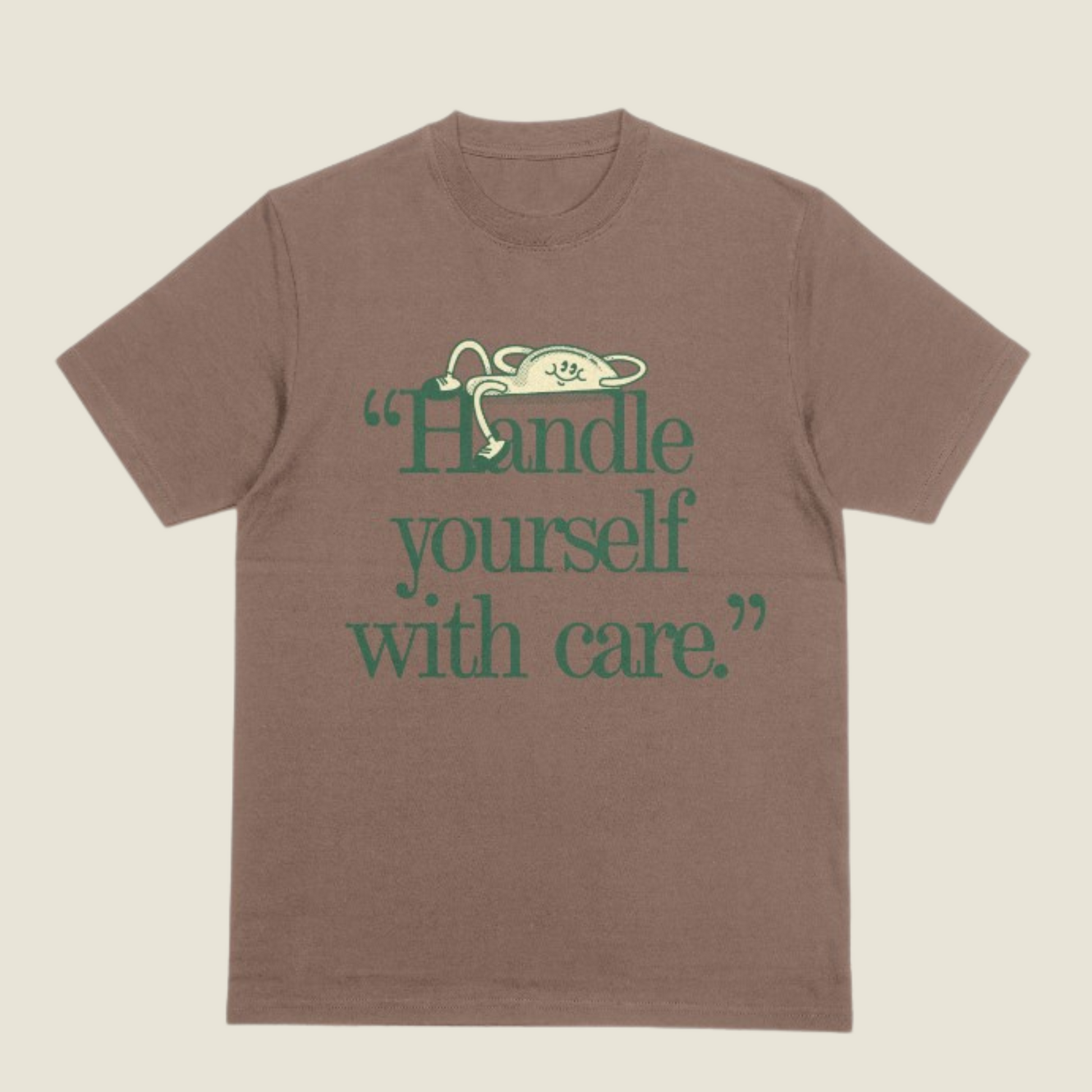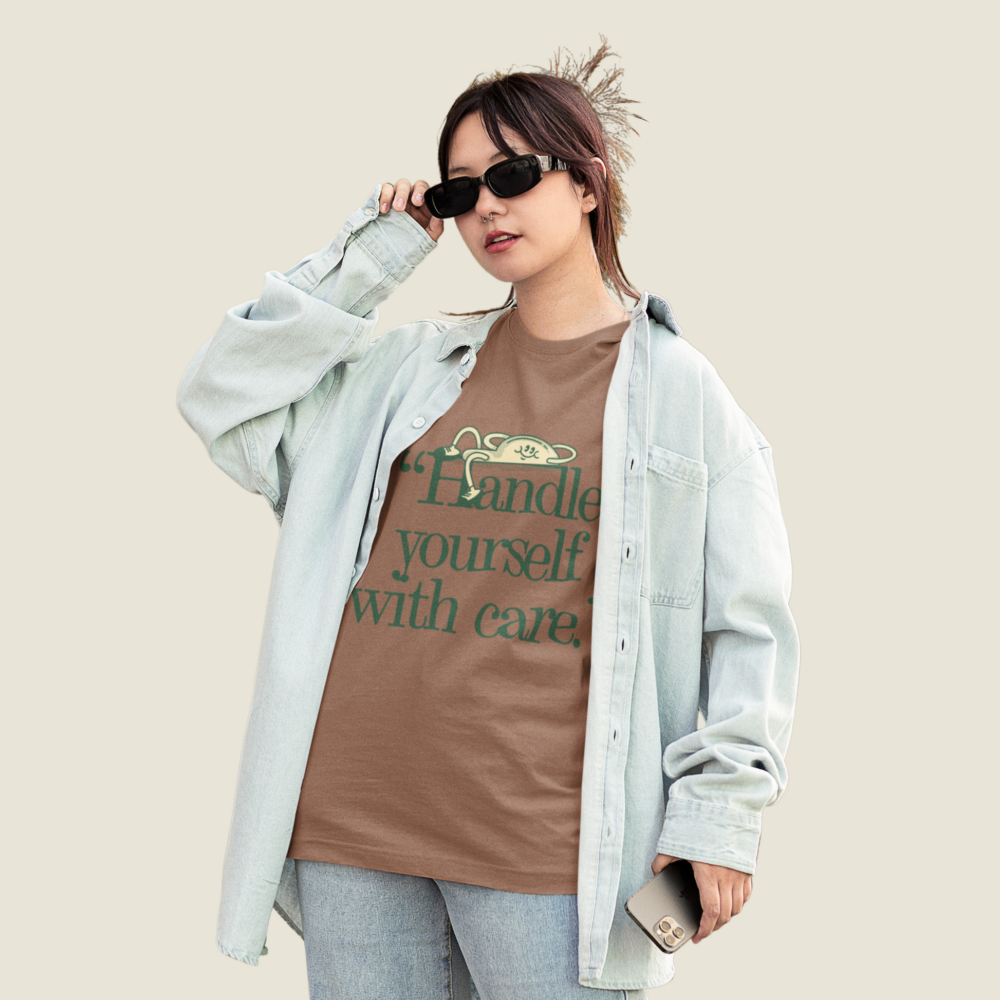 The Handle Yourself With Care T-Shirt is a key piece from our WEAR YOUR CARES collection—designed to promote self-care through inspirational apparel. This self-care t-shirt serves as a gentle reminder to prioritize your well-being and holistic health. Perfect for embracing moments of self-reflection and wellness, this stylish and comfortable tee makes a bold statement about self-love. Shop the Handle Yourself With Care T-Shirt today and let your apparel reflect your journey to self-care and balance!